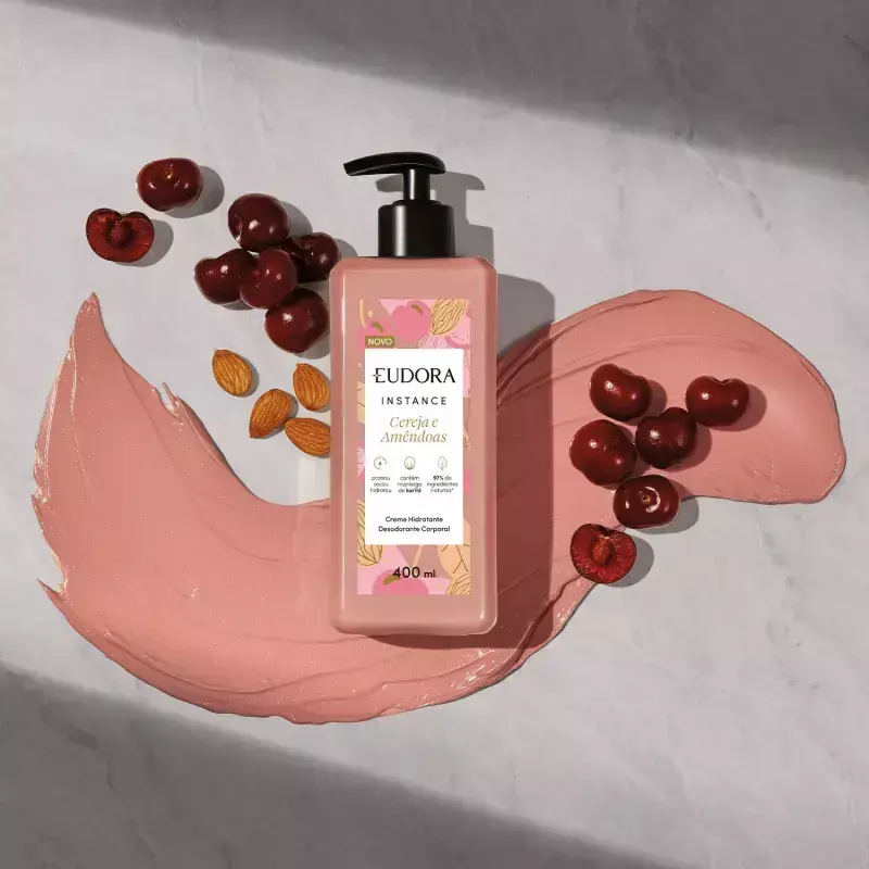 Creme hidratante desodorante corporal. Eudora Instance Cereja e Amêndoas hidrata e perfuma a pele com fragrância floriental adocicada.