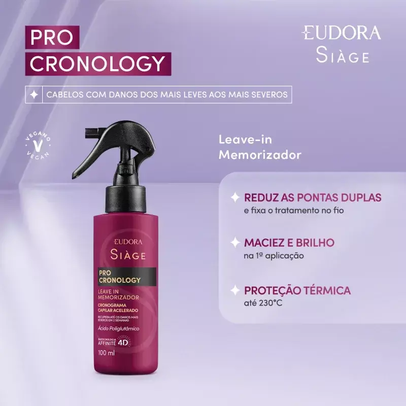O Leave in Memorizador Siàge Pro Cronology fixa o tratamento no fio mesmo após o enxágue e mantém seus cabelos tratados por mais tempo, agindo também como protetor térmico capilar. Confira abaixo todos os benefícios do finalizador: