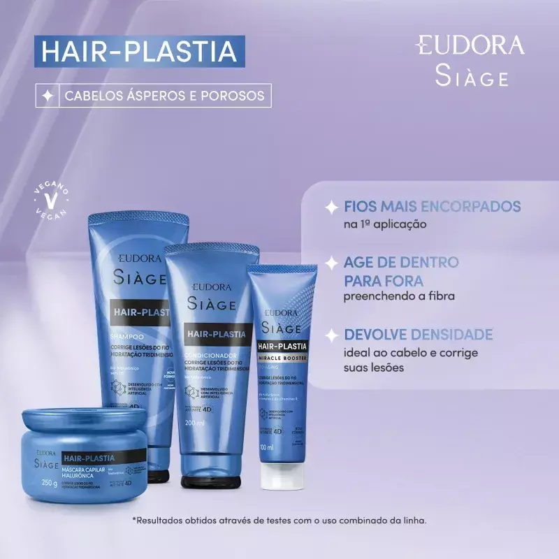 A Máscara Capilar Hair-Plastia Siàge Eudora age diretamente nos fios, promovendo uma ação hidratante tridimensional por muito mais tempo. Além disso, sua limpeza intensiva ajuda a eliminar a porosidade das madeixas, devolvendo toda a vitalidade e beleza desde o primeiro dia de sua aplicação. O resultado são fios encorpados e incrivelmente macios.