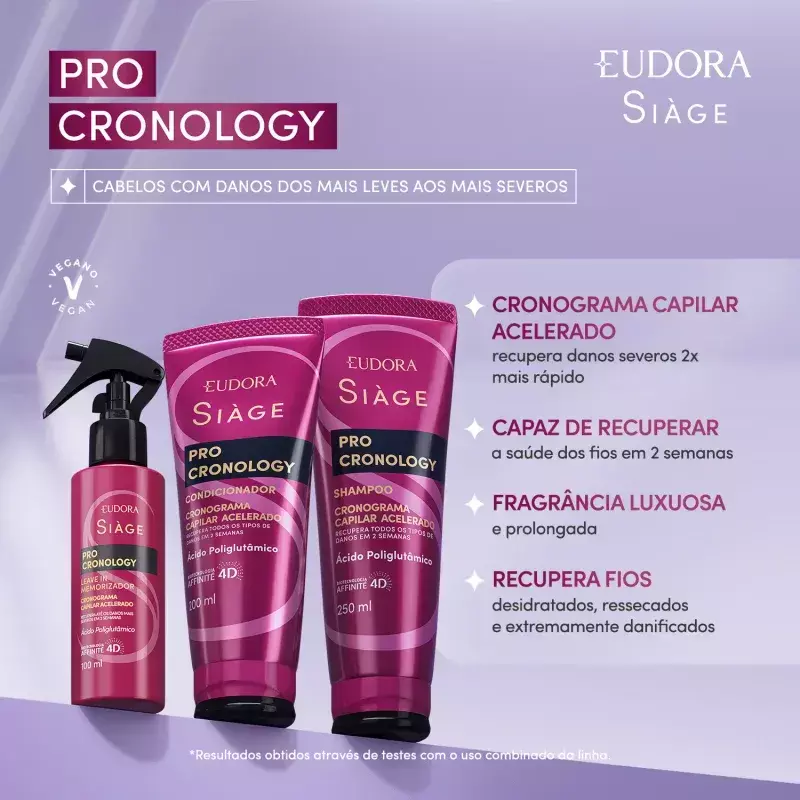 Para garantir uma ação tão eficiente, a linha Siàge Pro Cronology age nas 3 etapas do cronograma capilar proporcionando hidratação, nutrição com reposição de nutrientes essenciais e uma reconstrução poderosa que repara os danos.